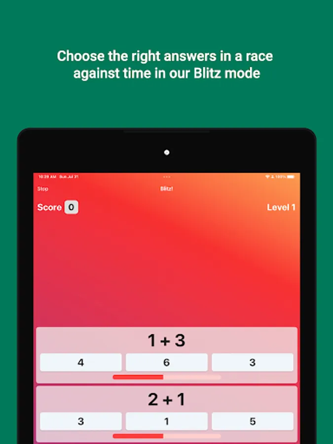 In the main game mode, Blitz!, your goal is to score as many points as you can, by answering a series of timed, multiple choice math questions.