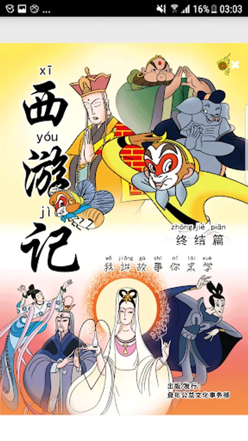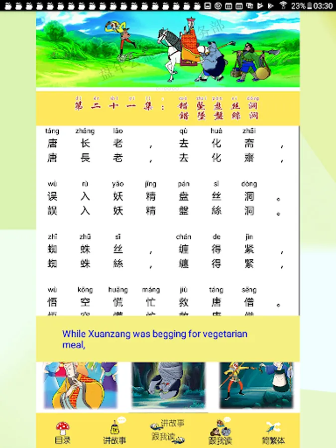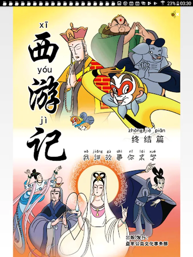 Each episode has a “Taletelling” menu and a “Read-With-Me” menu; both are equipped with sound tracks. The “Taletelling” part takes the children and the readers to the story itself, and lets them immerse themselves in the fantastic journey that Tang, Sun, Zhu and Sha were going through. In the “Read-With-Me” part, kids or readers will read aloud with the pre-recorded voice, learning to speak out the sounds of Mandarin and further enjoying the pleasure of learning the Chinese language.