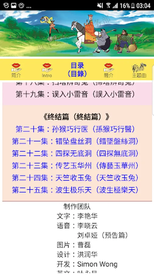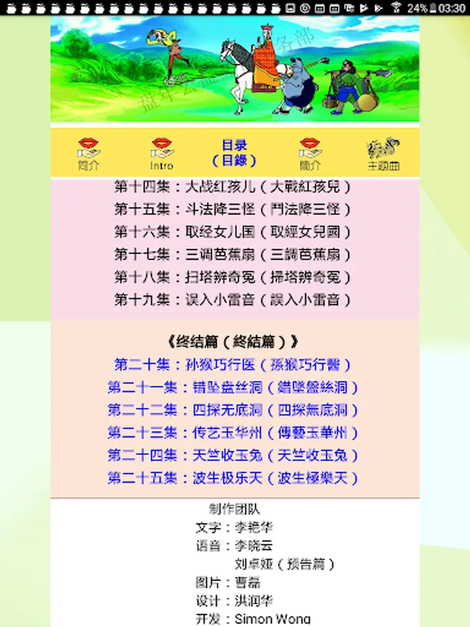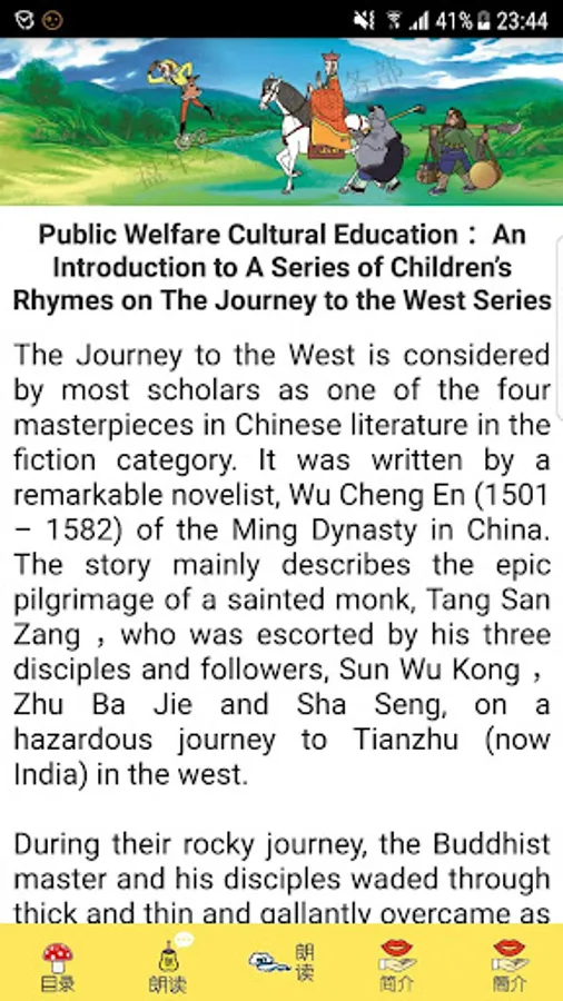 A collection of mobile applications, The Journey to the West Series, is produced to allow users to view the stories in caricature and to learn Mandarin in children’s rhymes. The purpose of our creation is to pique the young minds’ interest in the classic stories, their realization, appreciation and love of Chinese culture. An even more ambitious motive is to give children all over the world an opportunity to get in touch with Chinese culture and to enjoy some wondrous fantasies while they may start learning Mandarin. The whole collection has five volumes (5 sets), totaling twenty-five episodes. The “Introduction Volume” is the first set which can be down-loaded free of charge. Then follow the “First Set”, “Second Set”, “Third Set” and the “Grand Finale” (all of which are fee-charging downloads) .