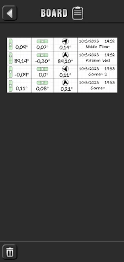 • Board - Allows you to read the saved bubble level gauges.