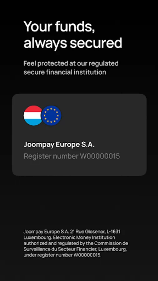 Joompay Europe S.A. 21 Rue Glesener, L-1631 Luxembourg. Electronic Money Institution authorized and regulated by the Commission de Surveillance du Secteur Financier, Luxembourg, under register number W00000015.