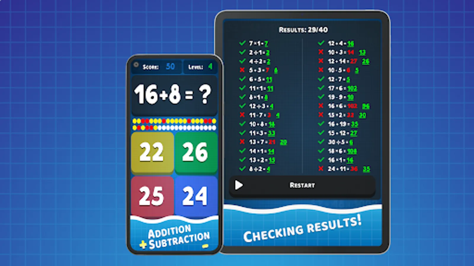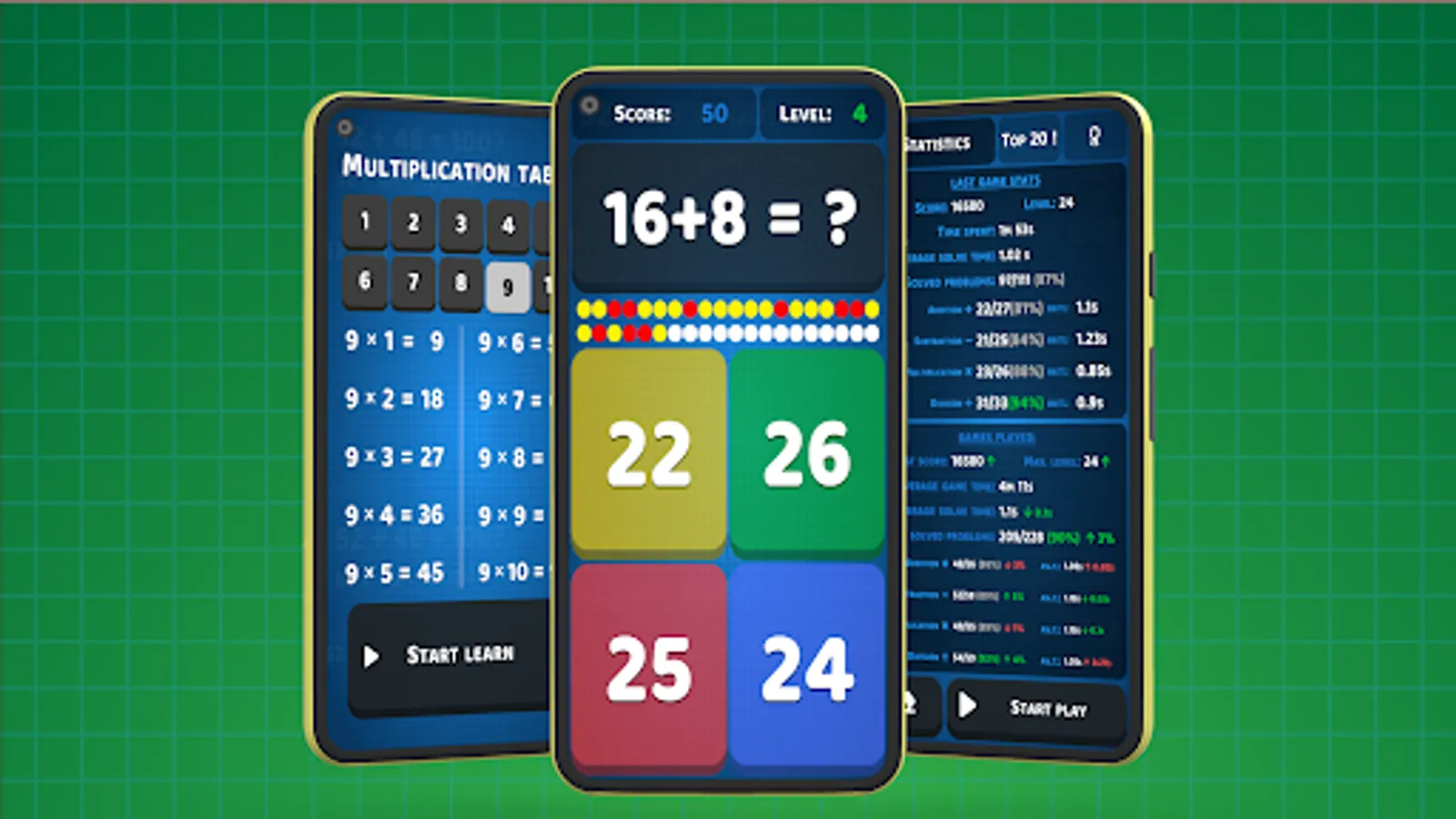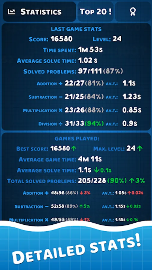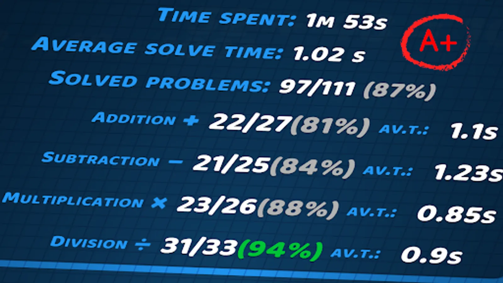 In Game Mode you will have to show all your arithmetic skills and times tables to solve math problems on addition, subtraction, multiplication and division. Any mathematical game trains arithmetic skills. But when the time to solve problems is limited, this skill rises at a higher level. The more math problems you solve, the more difficult are new problems. After every math game you will see detailed statistics table with your math skills data. Or you can compare your results with worldwide math leaders.