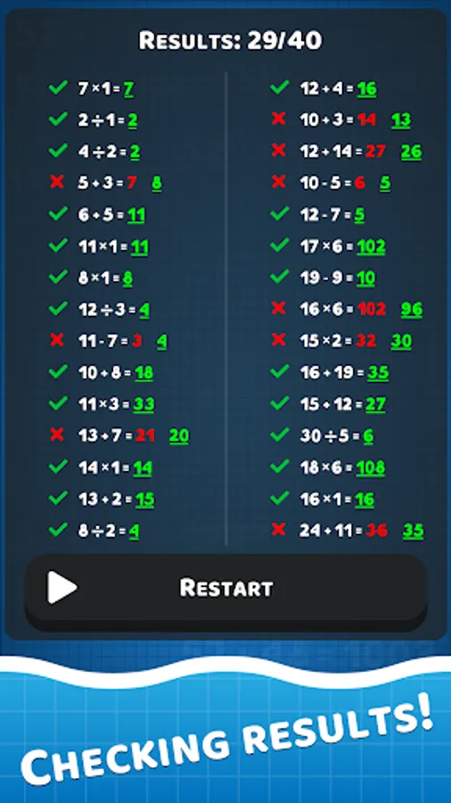 In Learn Math mode you are not limited with time and after session you can check your results in a table.
