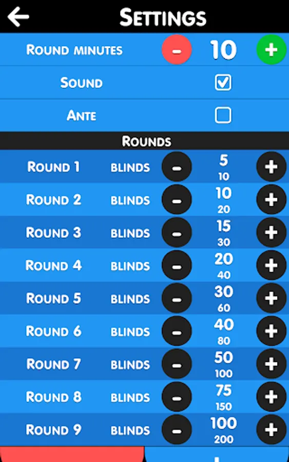 Create your poker rounds as much as you want: add blinds, delete blinds, edit blinds as you need for your poker party!