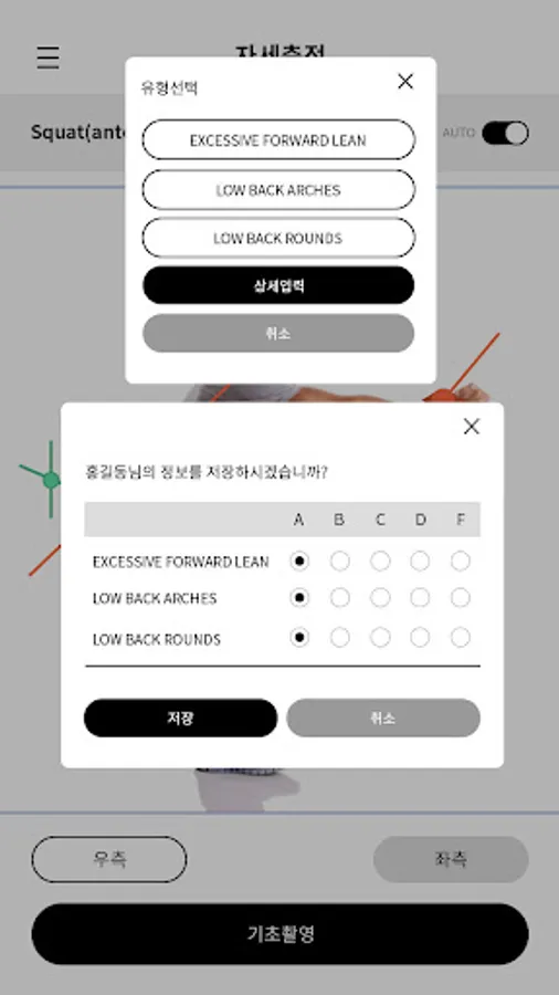 ② 동적 기능검사(스쿼트, 스텝업, 한발 스쿼트)분석 카메라를 통해 움직임의 문제를 찾아줍니다.
