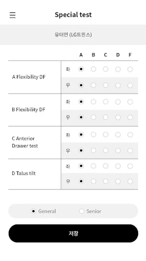 ③ 일반인(general) 체력테스트, 시니어(senior) 체력테스트 결과값을 스마트폰에 입력하여, 회원의 현재 체력 상태를 찾아줍니다.