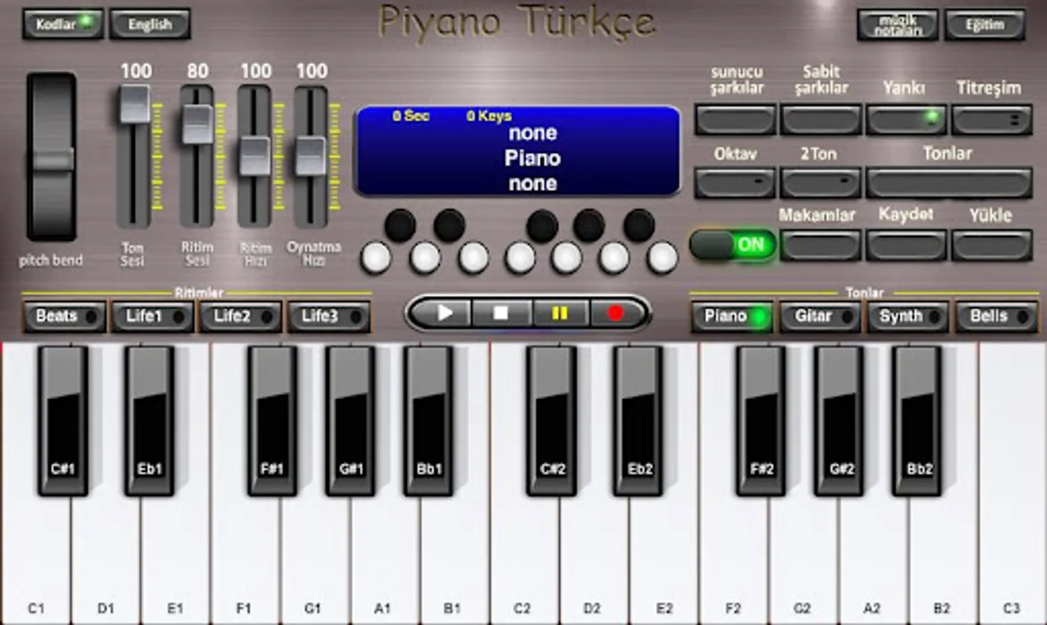 Turkey Piano application works with about 15 Turkish musical instruments such as piano, oud, guitar, organ, bell, bouzouki, etc. with very real and realistic sounds and contains within the same musical layers similar to real musical instruments with the same high/low pitches. You can also control the high, low, and sound of the beats that come with the app.