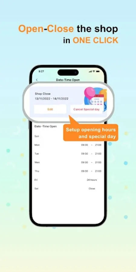 - Manage operation time and set up your shop profile easily