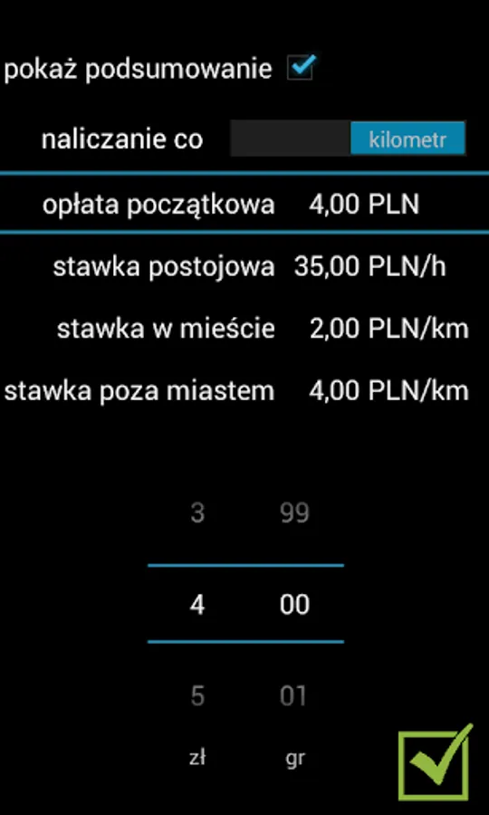 The application allows you to estimate how much a taxi ride should cost. Set the charges which apply in a taxi to get in and click the "START". The program will measure based on the GPS display the speed and distance that you covered and gives an indicative fee.