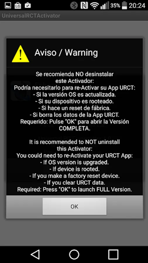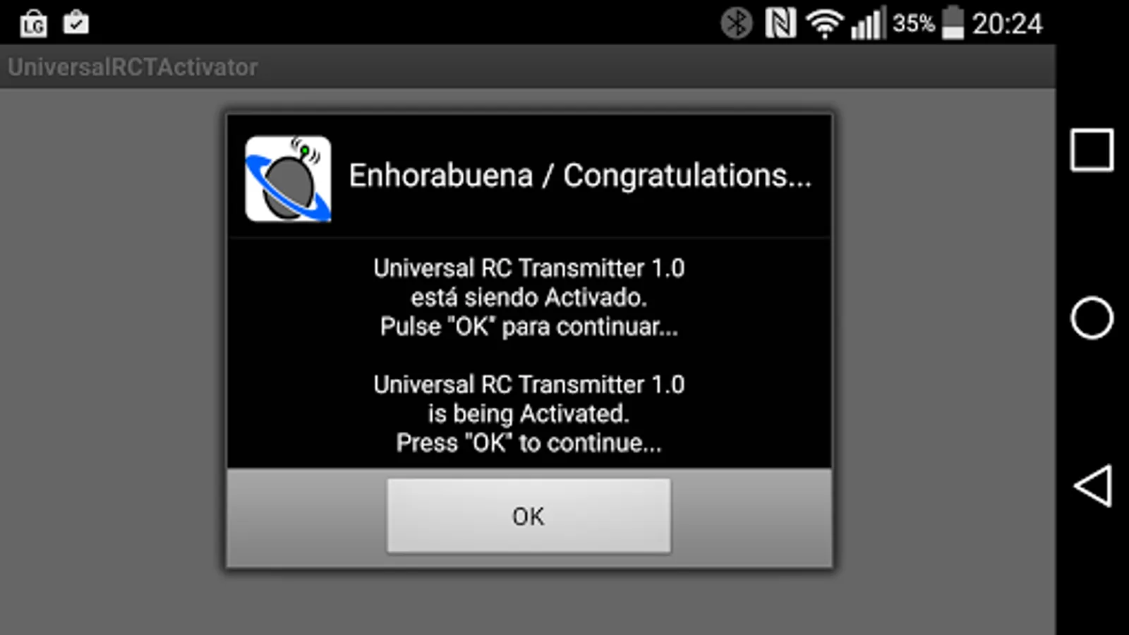 To eliminate the limitation of the 3 minutes per connection or control, as well as the limitation of the 2 configuration profiles of transmission session of Universal RC Transmitter, it is necessary to additionally download, install and execute this Universal RC Transmitter Activator. Once the Full version has been activated, it is recommended not to delete this Activator: you may need it to reactivate the application if you root the device, if you do a factory reset, if you delete the application data, or if you update the version of your OS Android system.