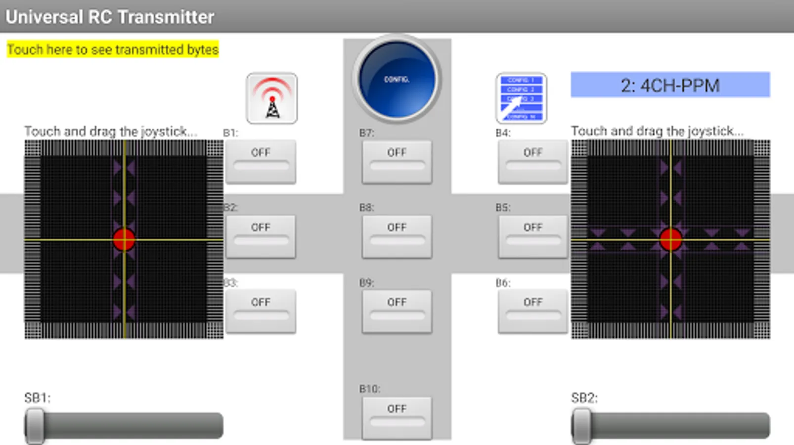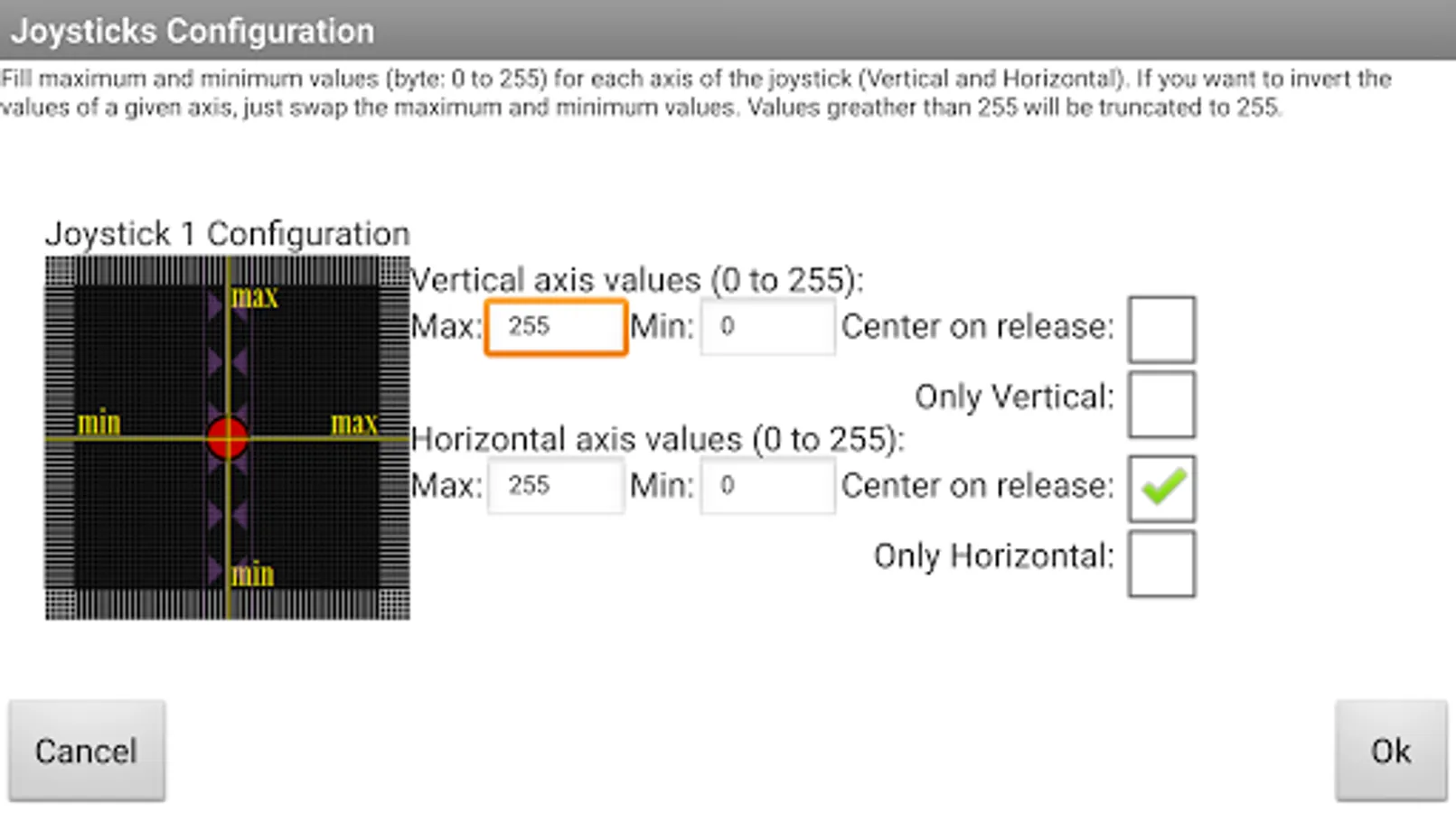 - 2 virtual joysticks (2 channels per joystick) with configurable range of values, horizontal and vertical constraints, as well as the possibility of automatic joystick centering in one or both axes.