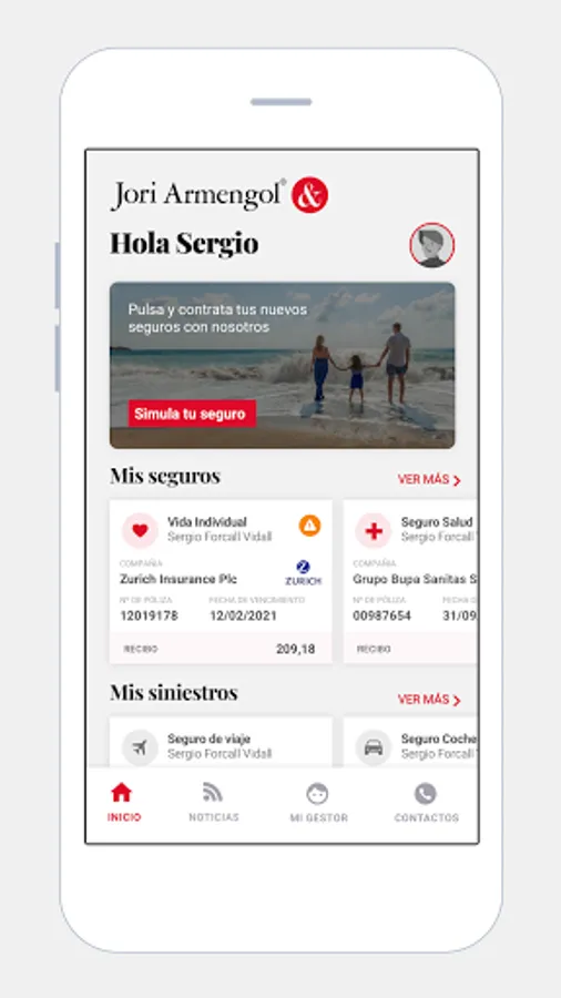 With a simple glance you will be able to see your contracted insurances and access the detailed information of each one of them. The app also allows you to register any type of claim and monitor its status. In addition, you can also contact your manager through a chat for inquiries.