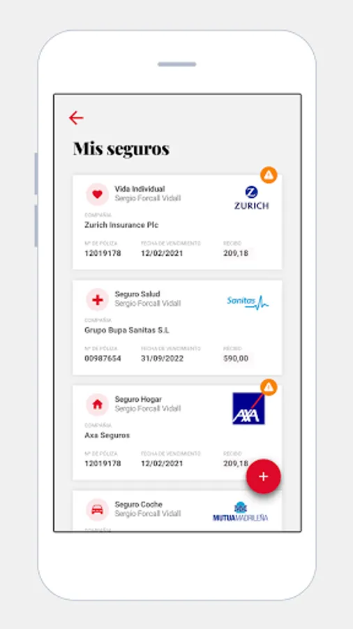 - Access all your insurances and see the information of each one in detail: status, policy number, insured risk, guarantees, documents, receipts, related claims, etc.