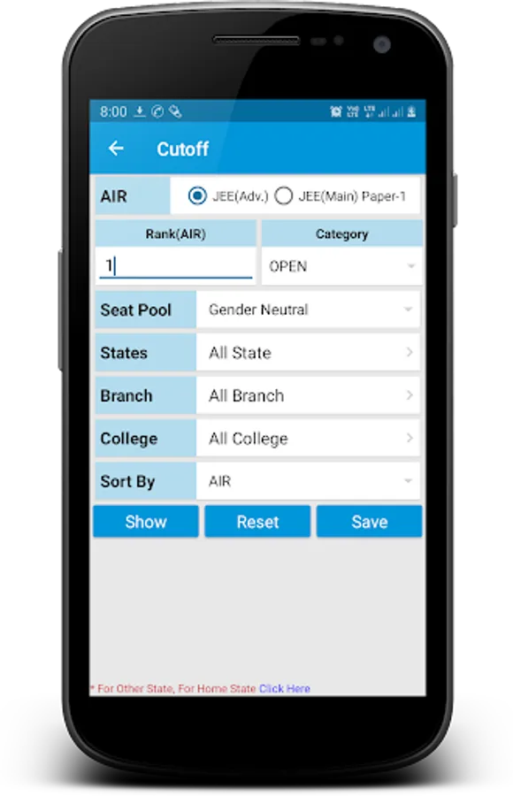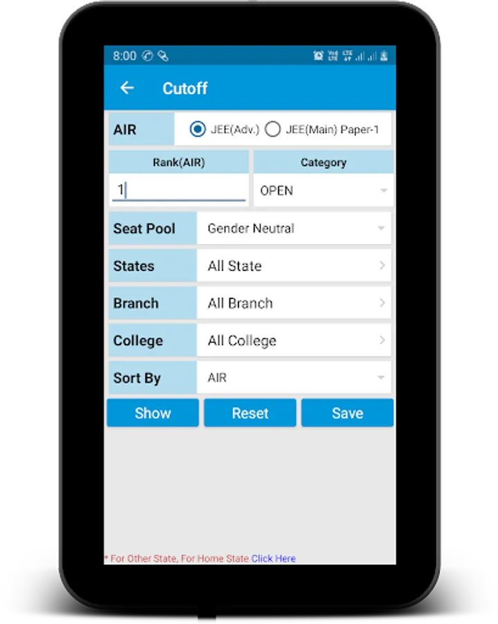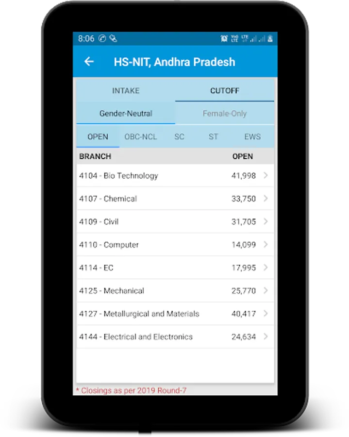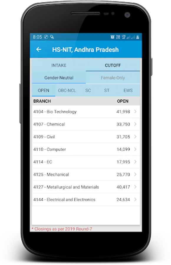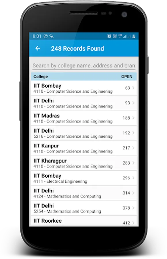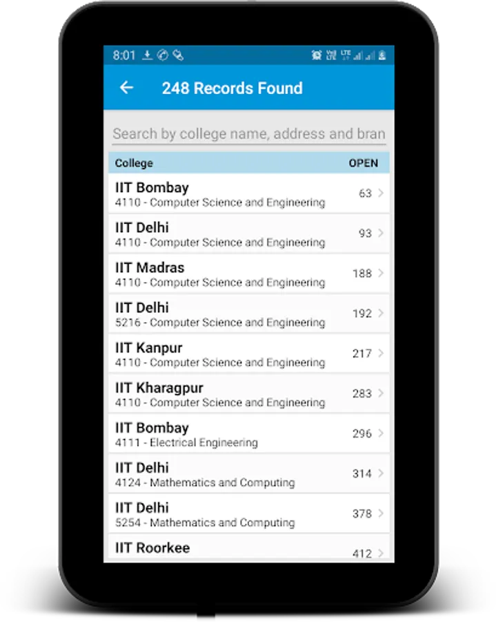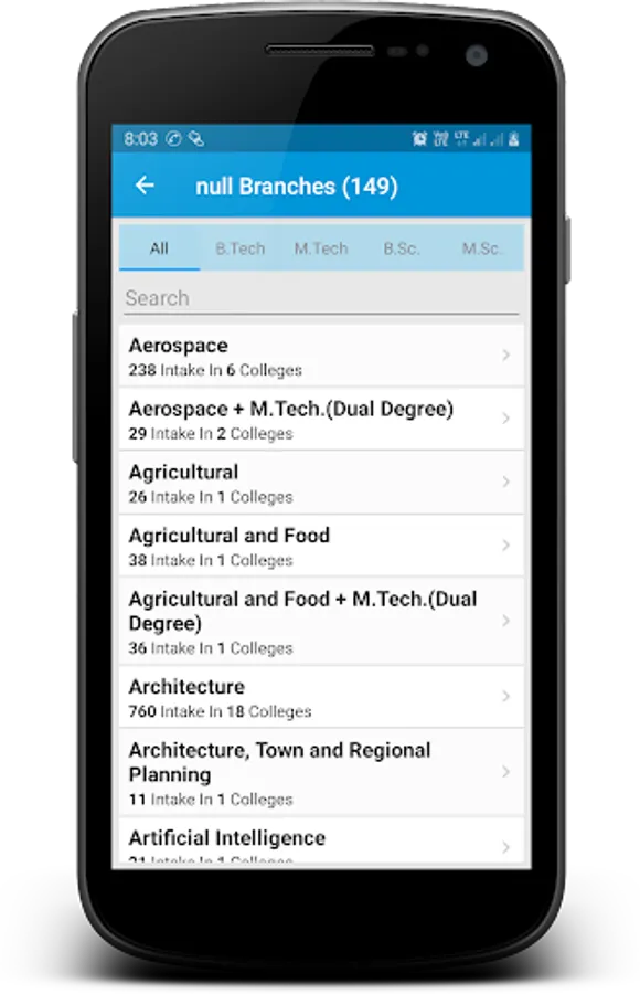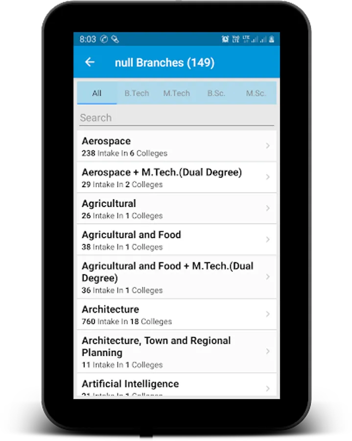 Branch Detail: The app shows a list of branches offered by various colleges. Easy filter to select your favorite branch. It shows the number of colleges that offers your favorite branch with total intake. An option is given to select B. Tech / M. Tech / B. Sc / M. Sc courses.