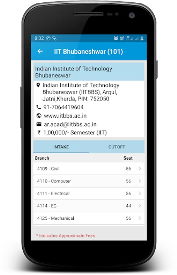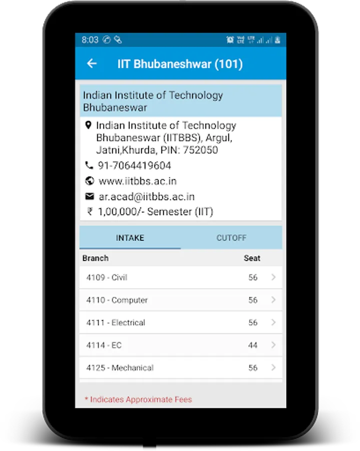 College Information: App shows a list of colleges with college name and city. It shows the detail of colleges like branches, intake, seat distribution, address, website, email, phone, etc. The app shows category (General, EWS, OBC-NCL, SC, ST) wise cutoff for all the offered branches.