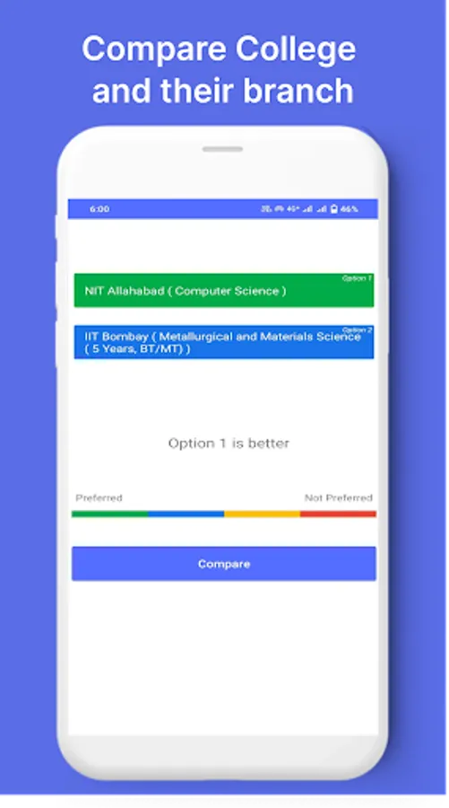 Students can compare two Options for JOSAA Counselling. The application will indicate color and message for comparison. Students can decide their final choice for JOSAA Counselling after comparison.