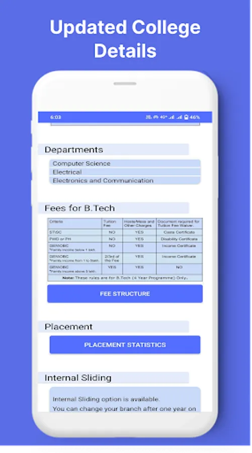 like Fee Structure, Criteria for the tuition fee waiver, NIRF ranking, Branch, Placement Statistics, and most important Internal sliding information.