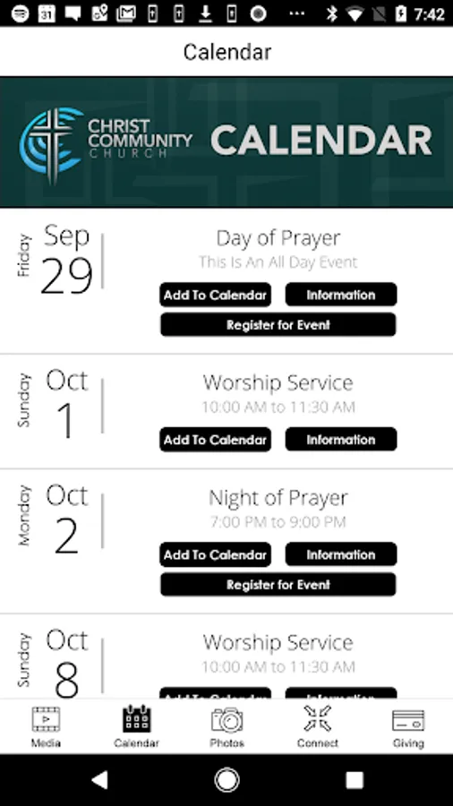 - View the in-app calendar to see what events are coming up at Christ Community Church and with the click of a button you can add the event to your device's calendar or get more information about the event.