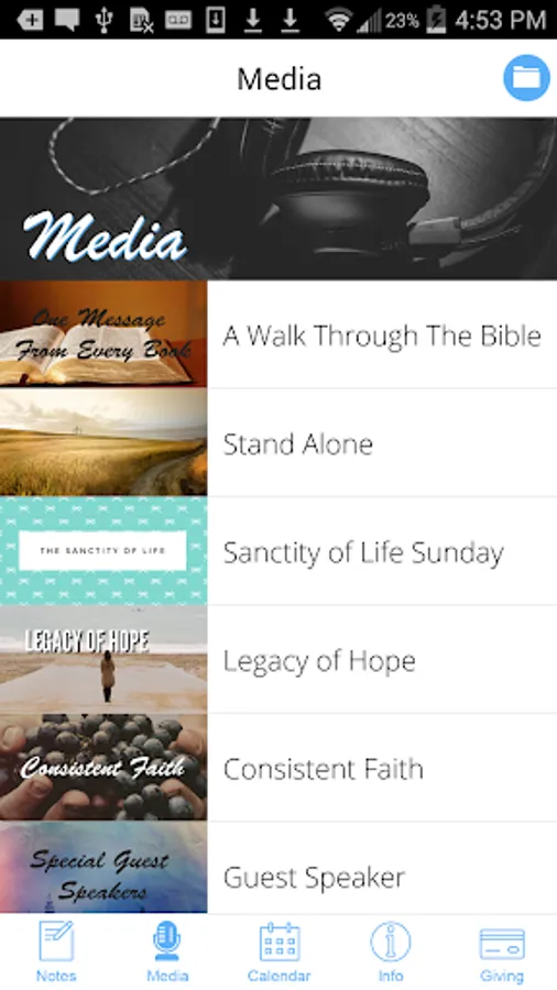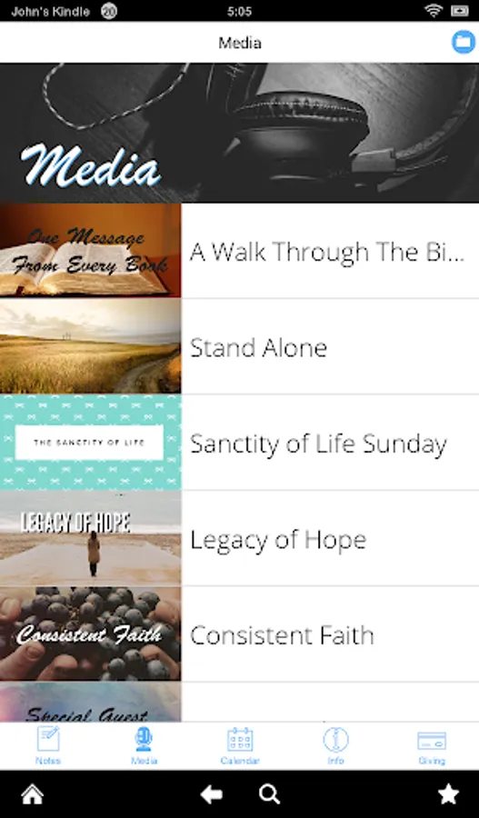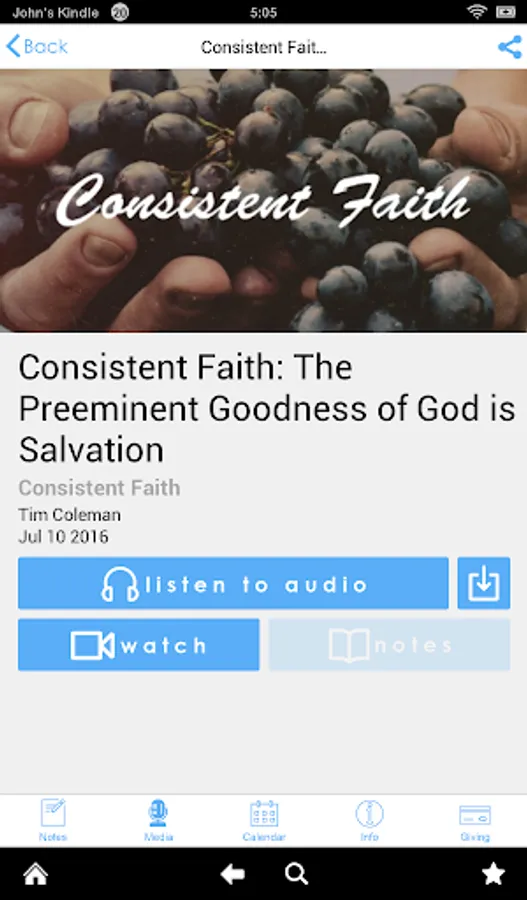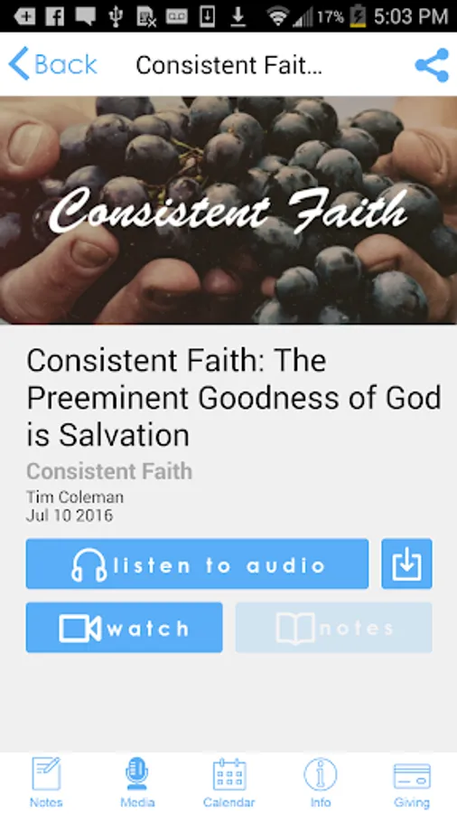 - Listen to podcasts of sermons in-app and then share them with friends through social media or email.