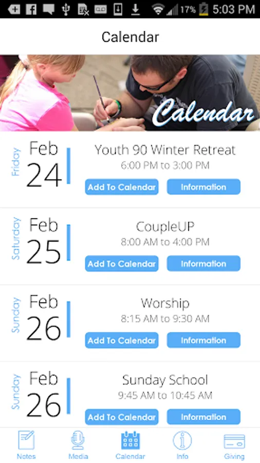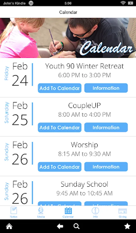 - View the in-app calendar to see what events are coming up at EBC and with the click of a button you can add the event to your device's calendar or get more information about the event.