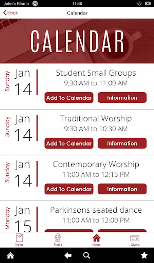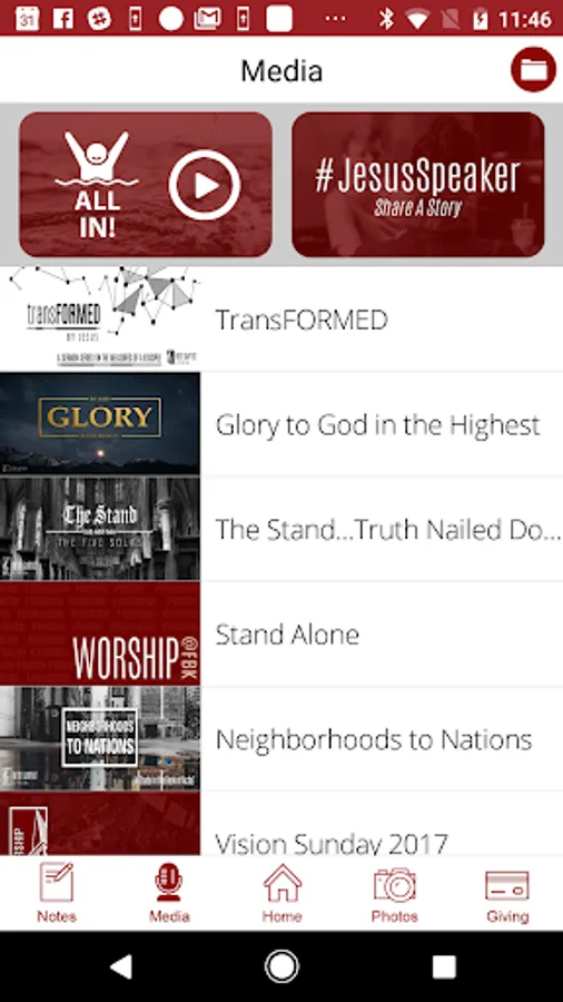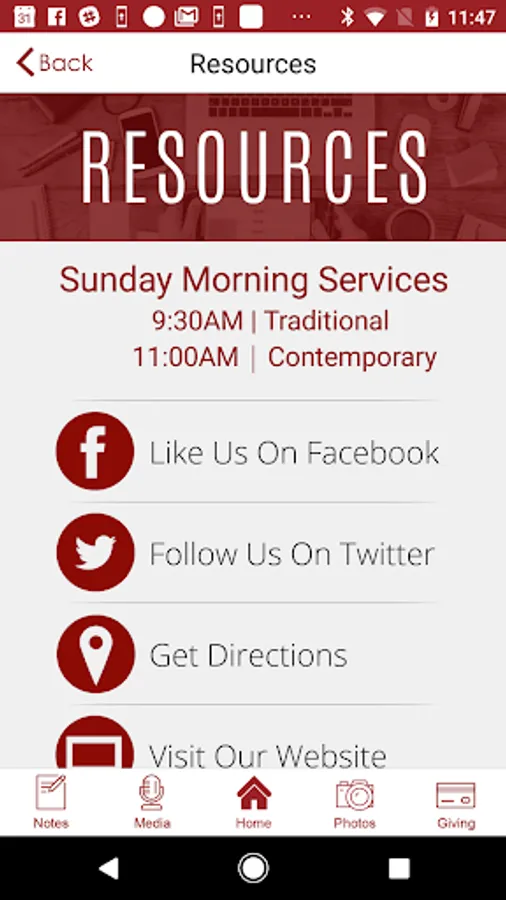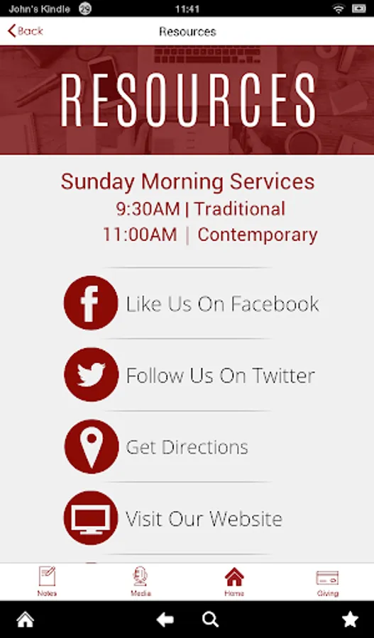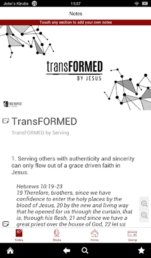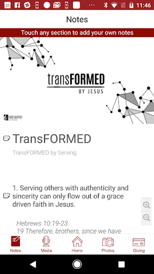- Take notes during our Sunday morning service right in the app. The Notes in the "Notes" section are updated each Sunday to include the notes for that day, so you can follow along, and add your own notes. You can take notes on any note or verse and then save or email the notes when you're done.