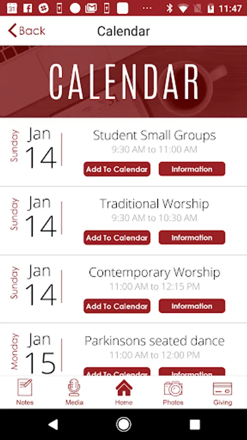 - The in-app calendar lets you view information about upcoming events and even add them to your device calendar. For events that include links (i.e.: RSVP options), there is even an option to view the link.