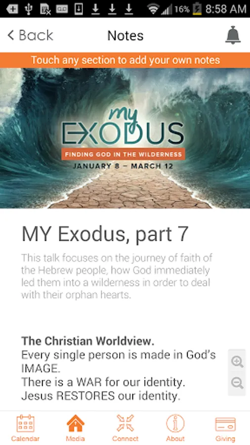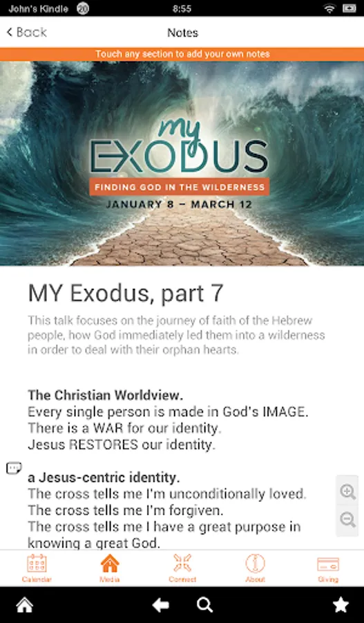 - Take notes during our Sunday morning service right in the app. The Notes in the "Sundays" section is updated each Sunday to include the notes for that day, so you can follow along, and add your own notes. You can take notes on any note or verse and then email the notes when you're done.