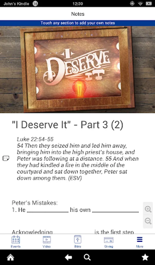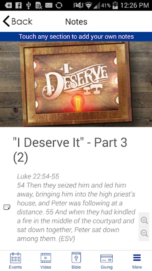 - Take notes during our Sunday morning service right in the app. The Notes in the "More" section is updated each Sunday to include the notes for that day, so you can follow along, and add your own notes. You can take notes on any note or verse and then email the notes when you're done.