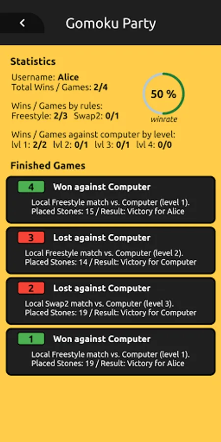 - Overview of player statistics and past games