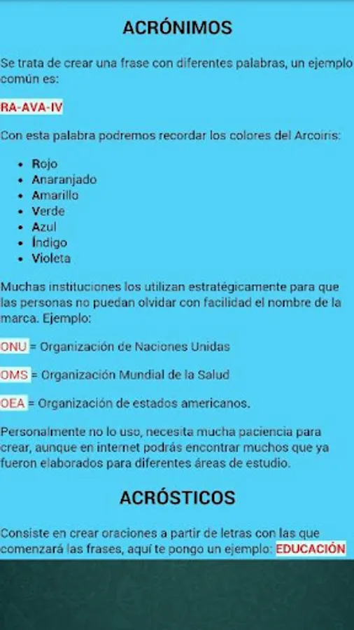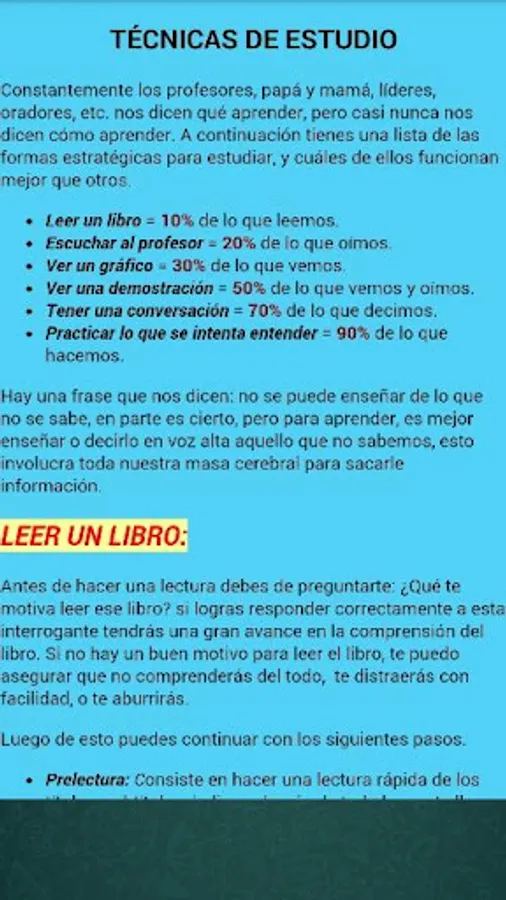 Our teachers, leaders, dad or mom constantly tell us what we should learn, but they almost never tell us how to learn, that is to say what are the processes that we must carry out in order to keep the processed information in our memory; that is why this application has the objective of helping all the people who want to improve their performance in their studies.