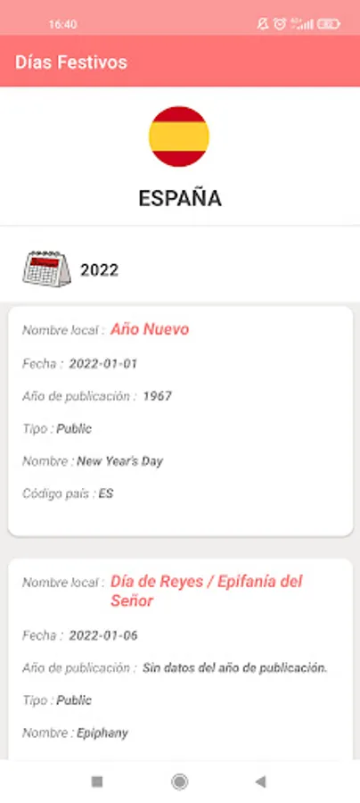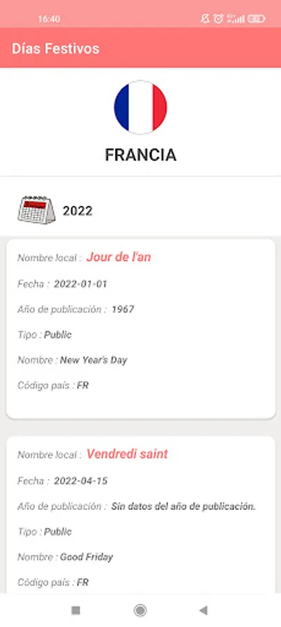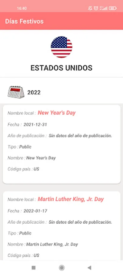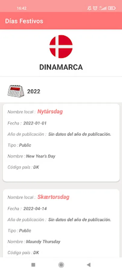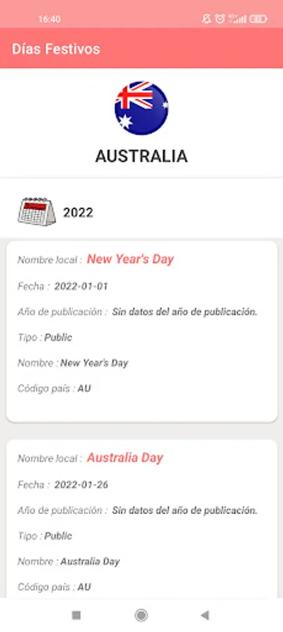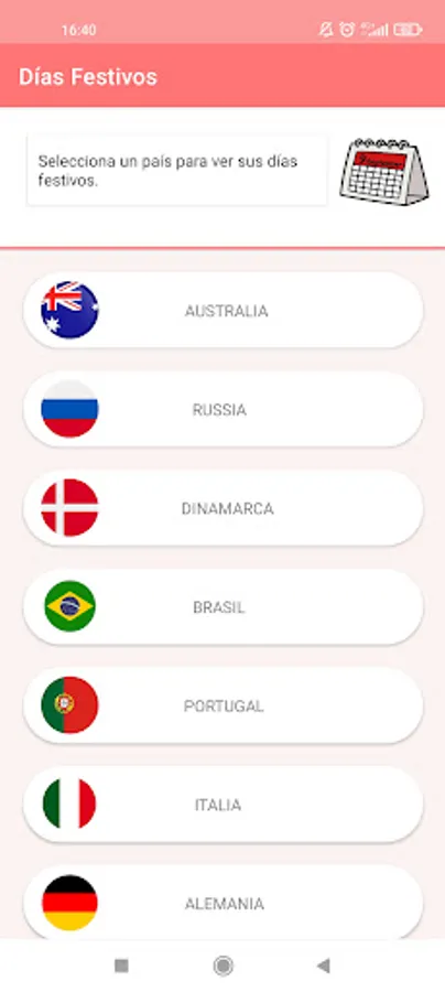 Holidays is a mobile application that shows information about the holidays that each country has. The list of countries available to consult these days are: Australia, Russia, Denmark, Brazil, Portugal, Italy, Germany, France, Spain, the United States and Mexico.