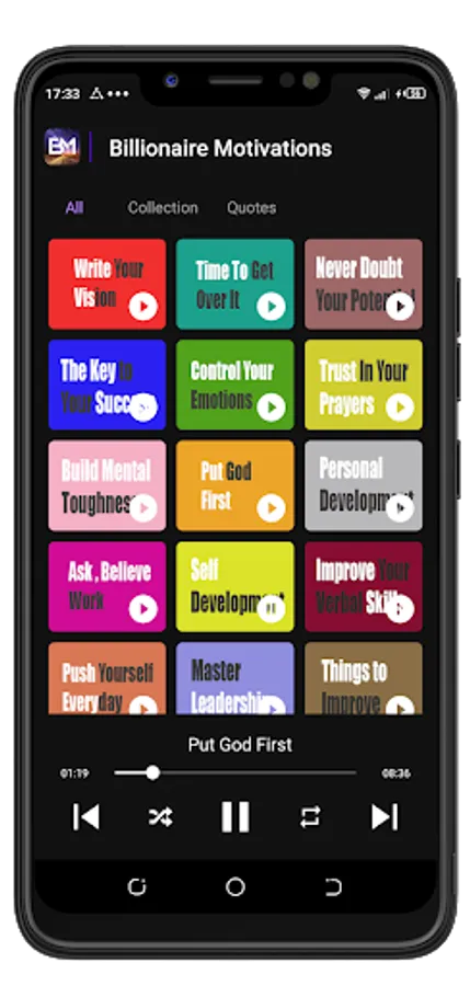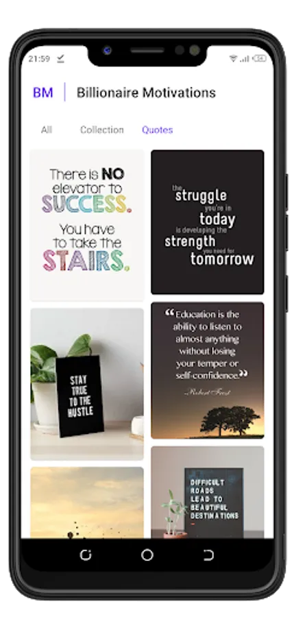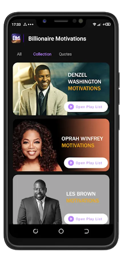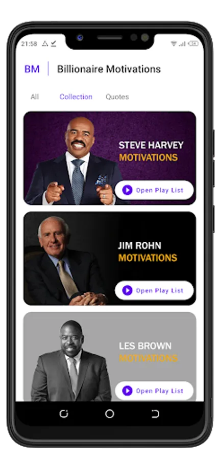Billionaire Motivation is an inspirational and motivational application with a collection of motivational audios and imagery to motivate and boost your positivity towards goal achievement. It contains motivational speeches from famous and popular successful speakers around the world. Stay motivated each day with Billionaire Motivations.