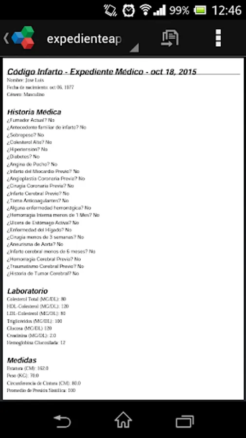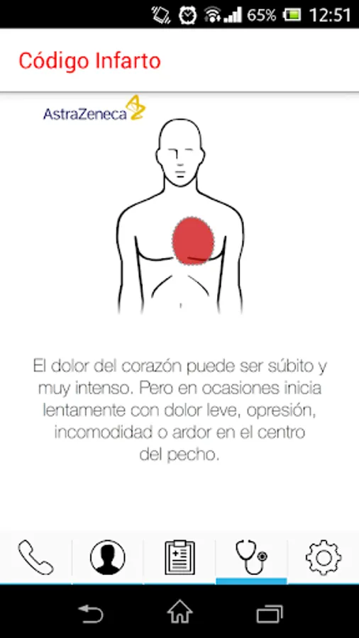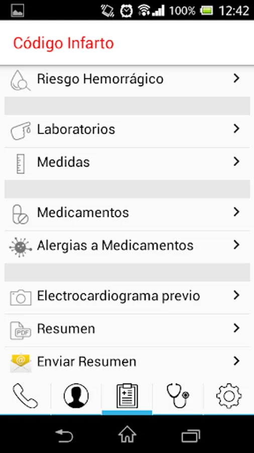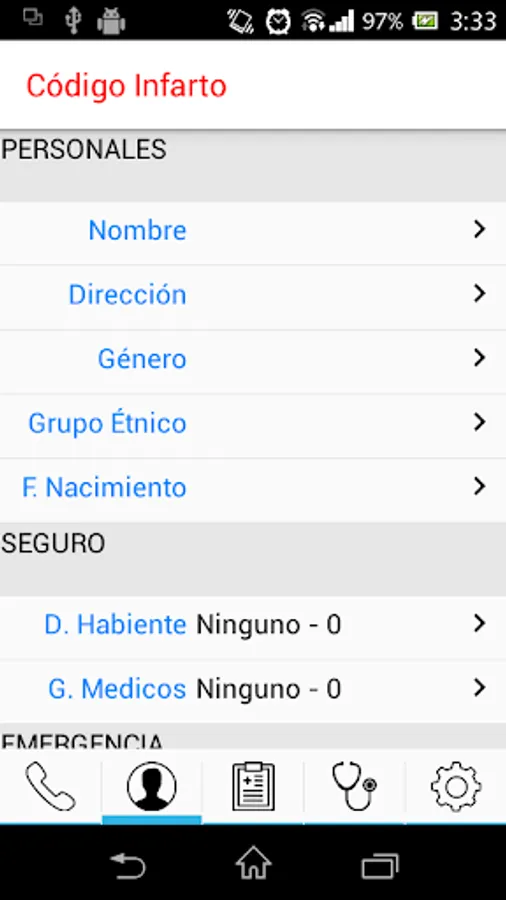 Myocardial code enables the user to store their personal data and designate contacts for notification in case of emergency. Allows medical information stored on your device, with sections for cardiovascular risk factors, history of cardiovascular disease and medical conditions that increase the risk of bleeding in case you need anticoagulants for the treatment of a heart attack. Risk factors are highlighted in green when they are absent and red when they are present in order for the user to know the elements that should be amended.