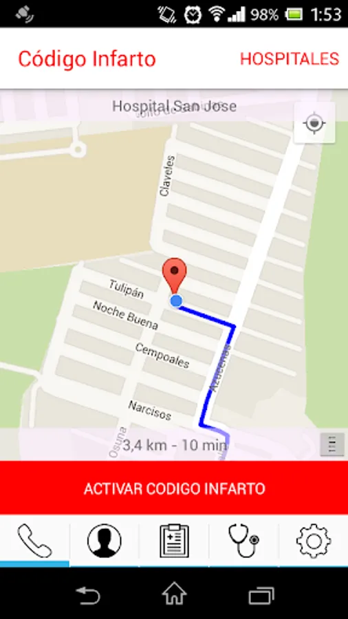 Myocardial code to activate a map showing the route to the nearest hospital appear. If the user wishes, you can choose another hospital. The application shall notify the ambulance service available to seek care.