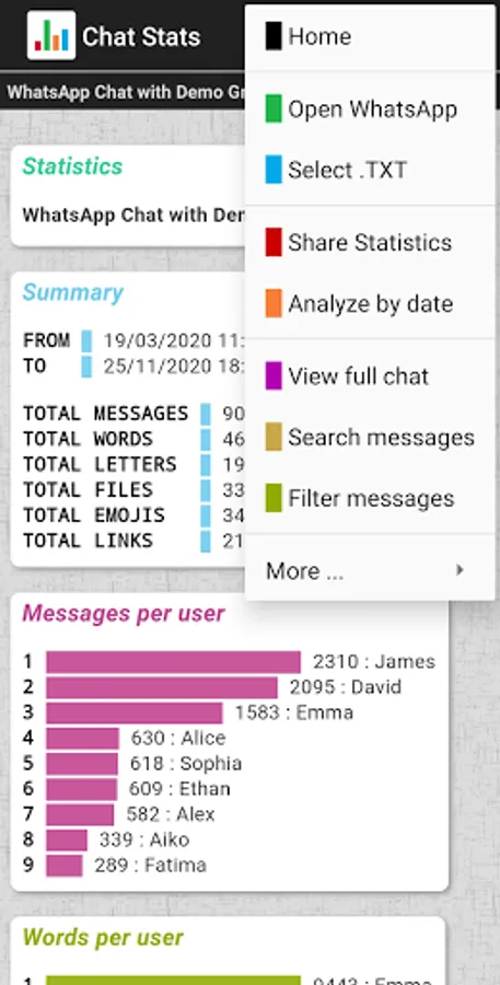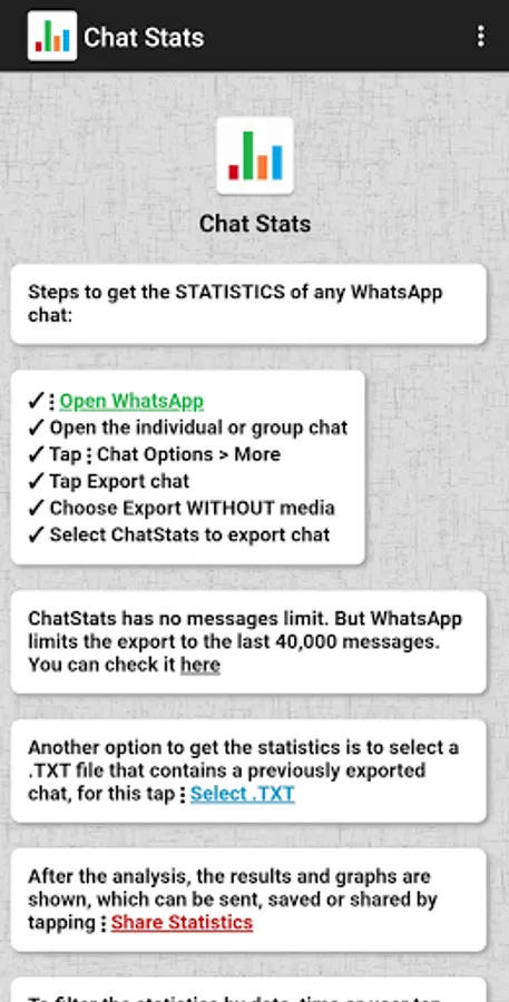 To obtain the statistics, simply export the individual or group chat from WhatsApp to this 'Chat Stats' app