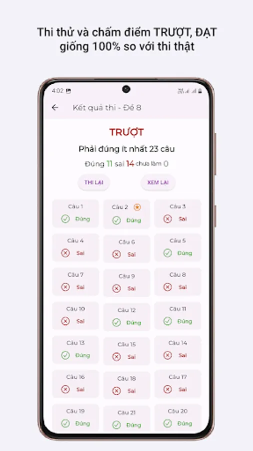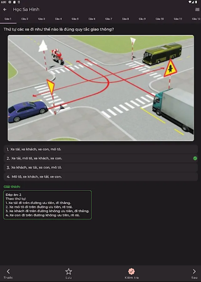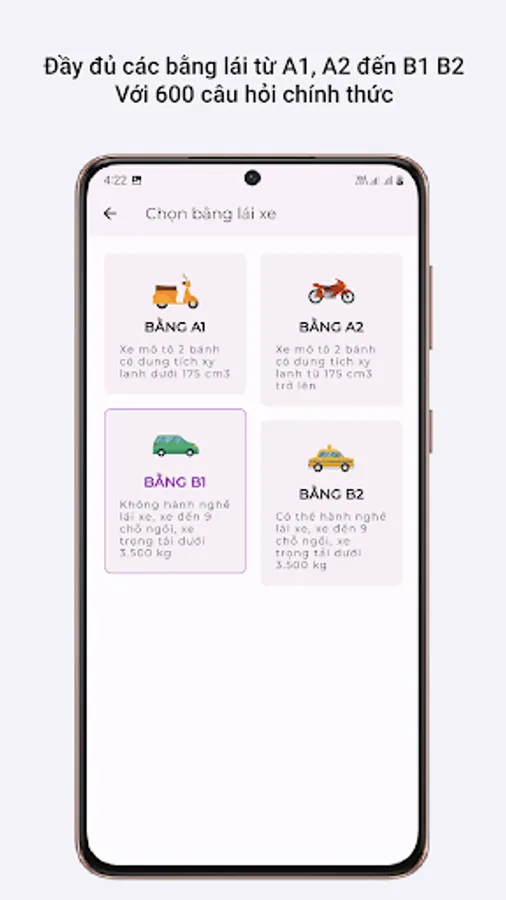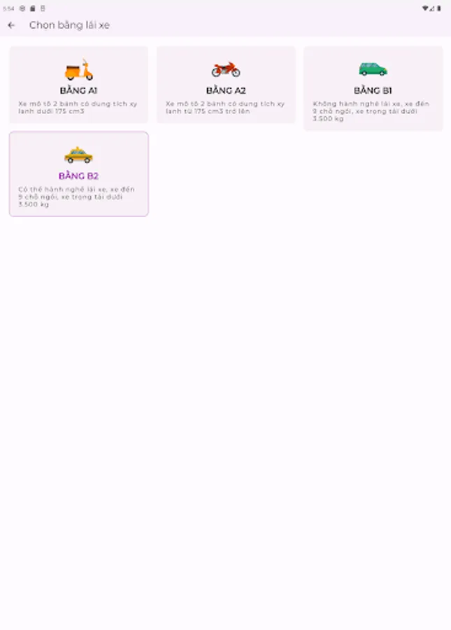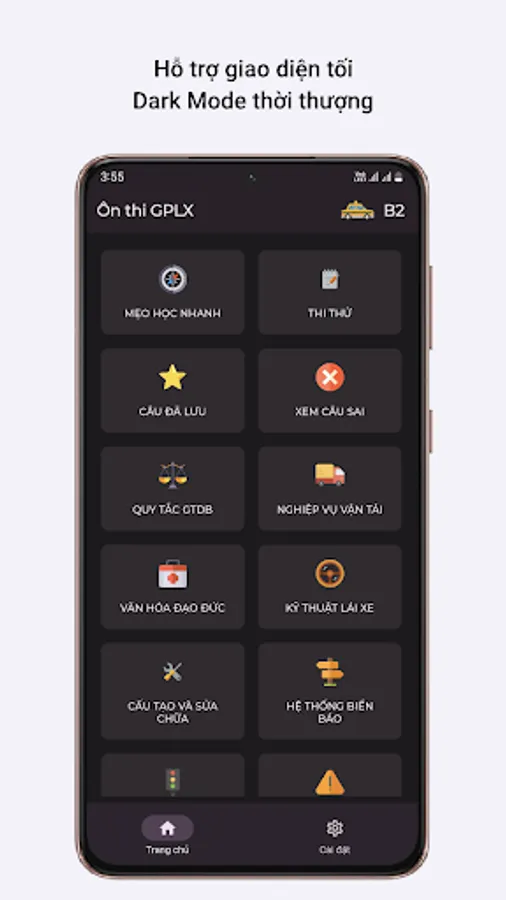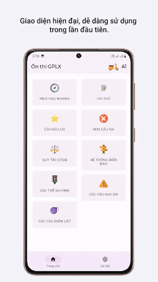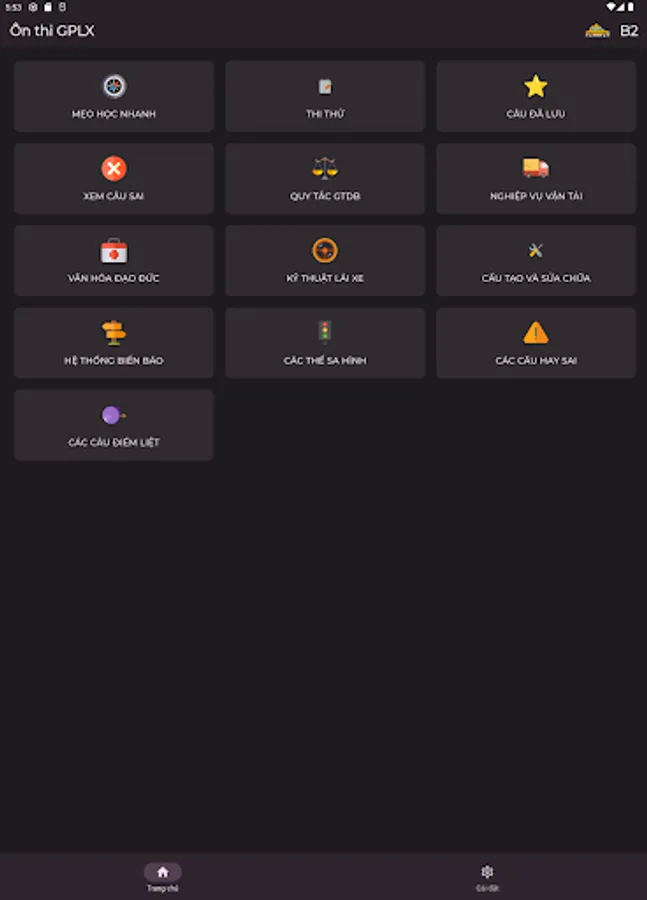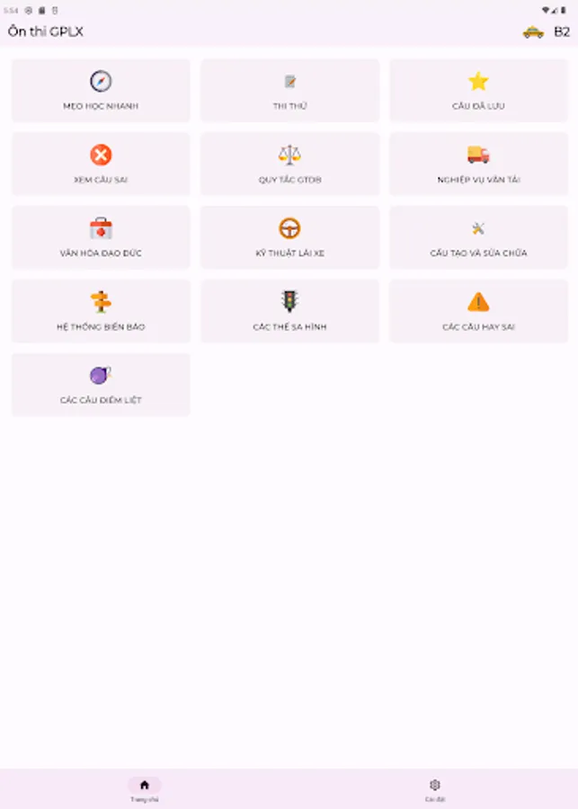 - The mode of practice test, time, and grading method is the same as the real test, according to the exam structure of the General Department of Roads of Vietnam Ministry of Transport for A1, A2, B1, B2 driver's licenses.