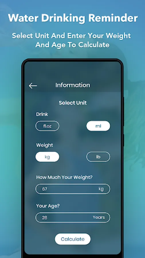 - Find out the exact water intake for a day, based on your age and weight.