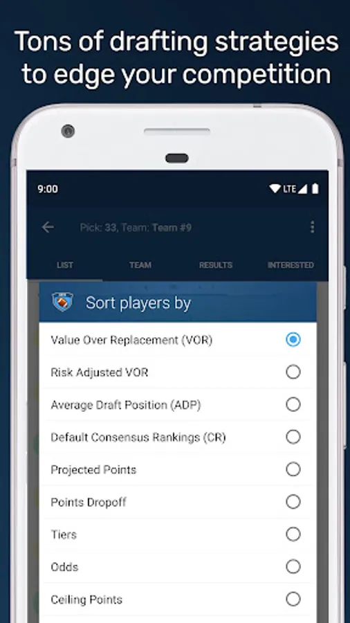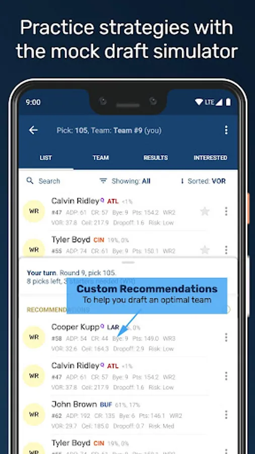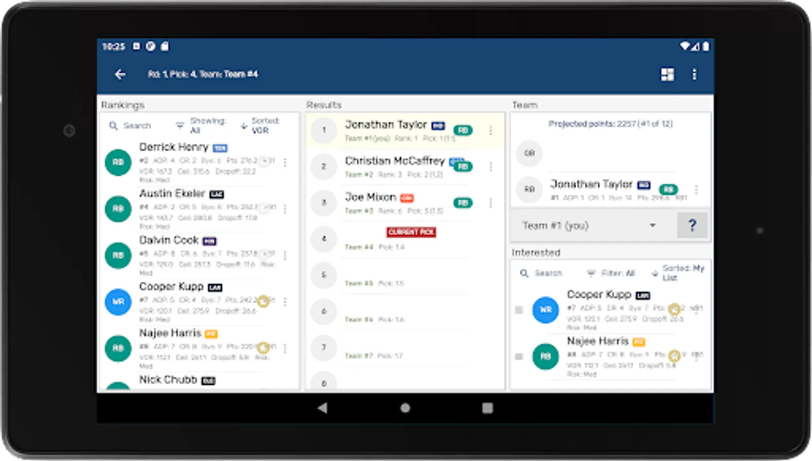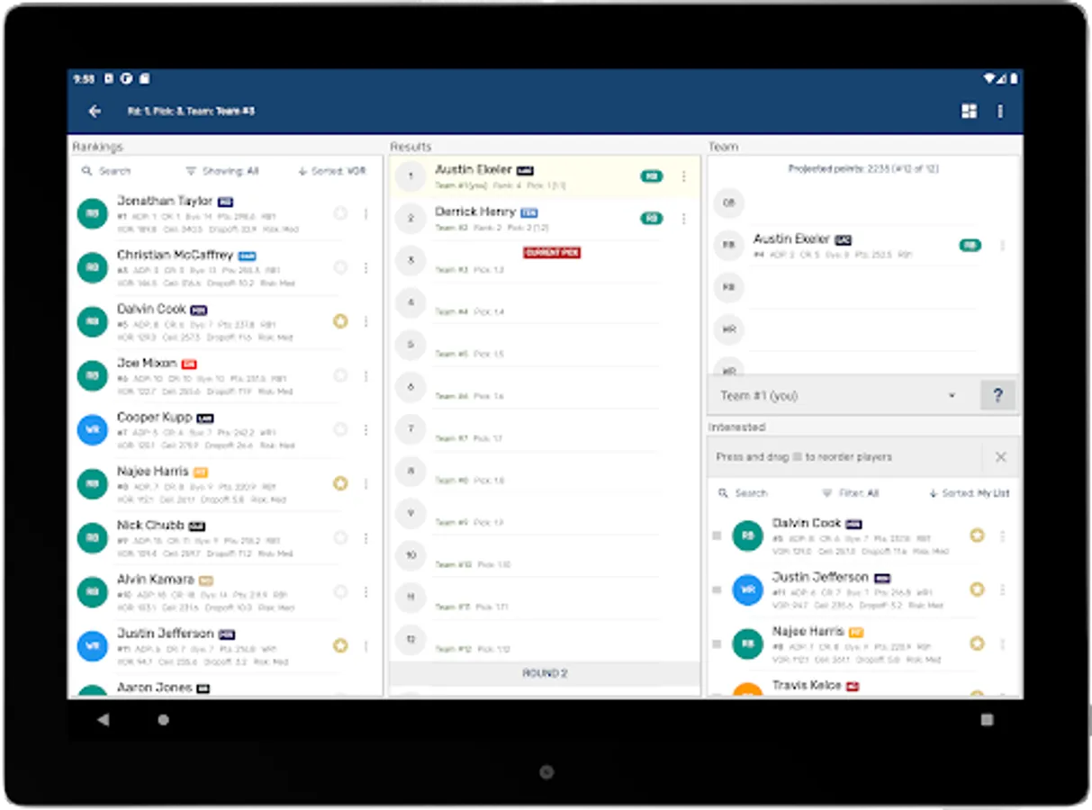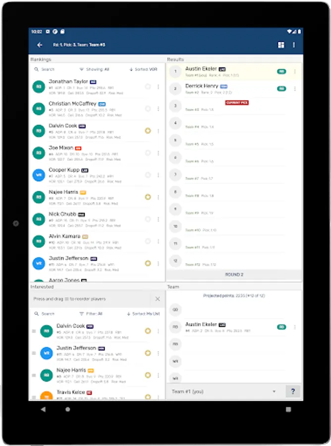 * Dynamic insights as you start drafting players like team needs, recommended picks, points dropoff, and percentages that a player will be available next time you need to draft.