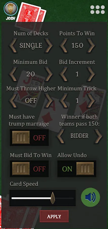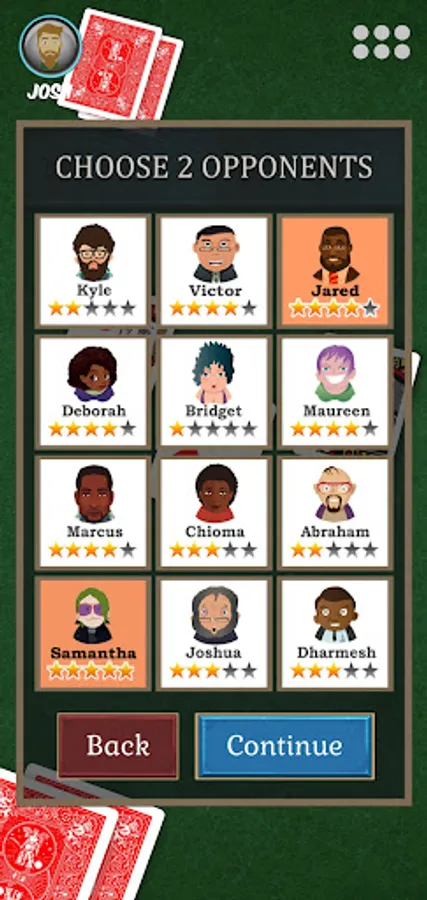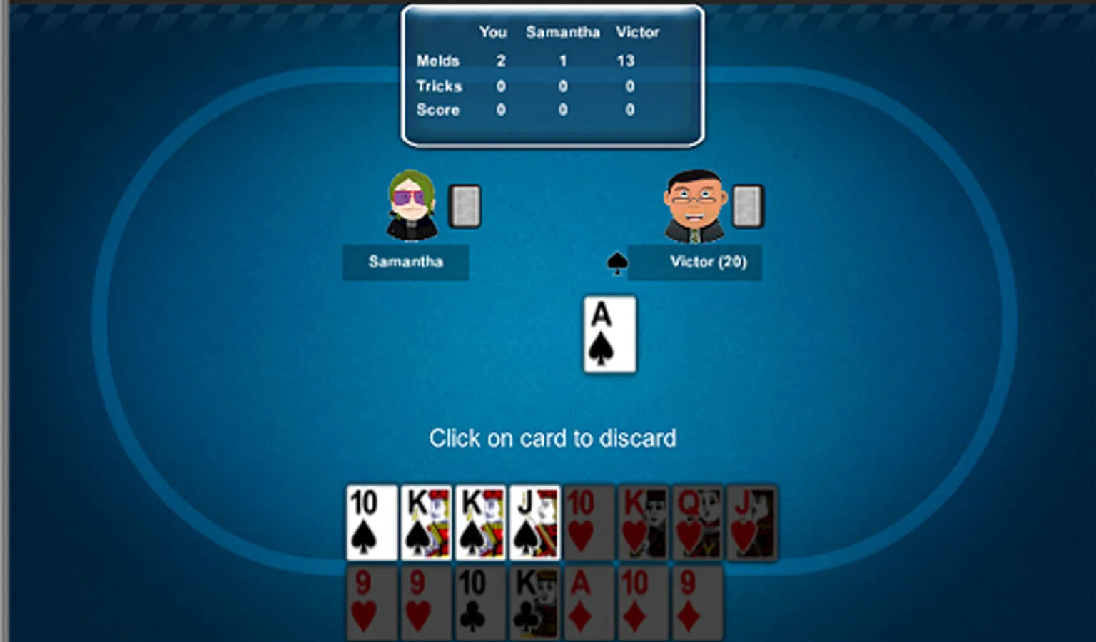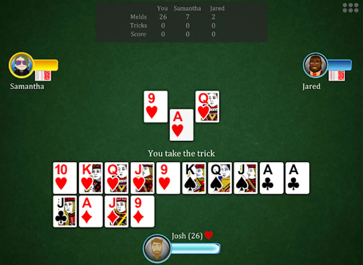 In this game, you can play online against real people or choose between 8 computer opponents, each with different skill levels and unique styles of playing. Each player is dealt 15 cards with 3 cards dealt face-down to the widow. Players bid after initial cards are dealt and the high bidder combines the widow cards to potentially form a stronger hand, then discarding the three weakest cards.