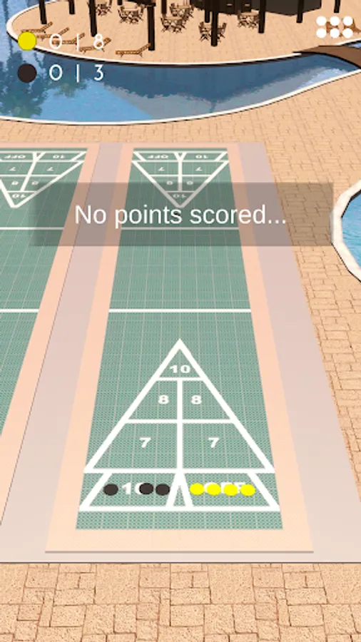 The scoring areas are divided by lines, into six zones: 10, 8, 8, 7, 7, 10-off. After all 8 disks have been played from one end of the court (a frame), the final score values for each player in the scoring zones is assessed: If a disk is completely within a scoring zone without touching (overlapping) any part of the border-line of the zone, it is good and that zone value is added to the correct player's score for the frame, and then to the player's total points.