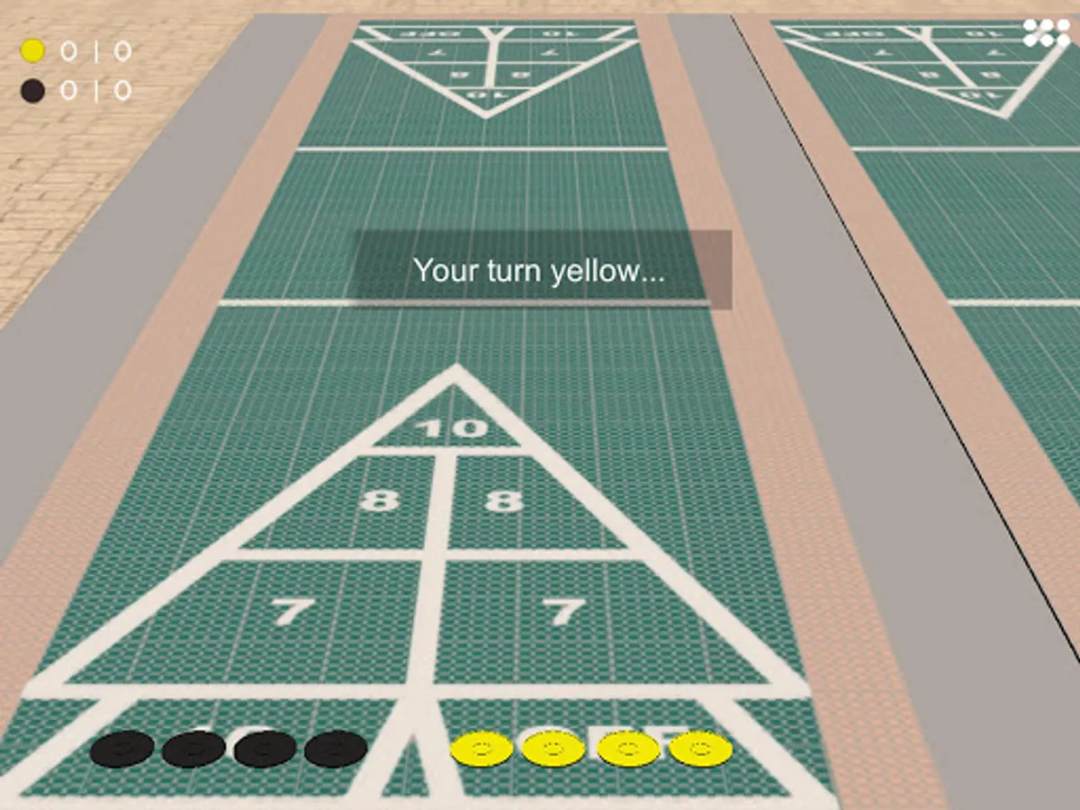 In deck or floor shuffle board, players use a cue, to slide their disks down the court, attempting to land within a marked scoring areas.