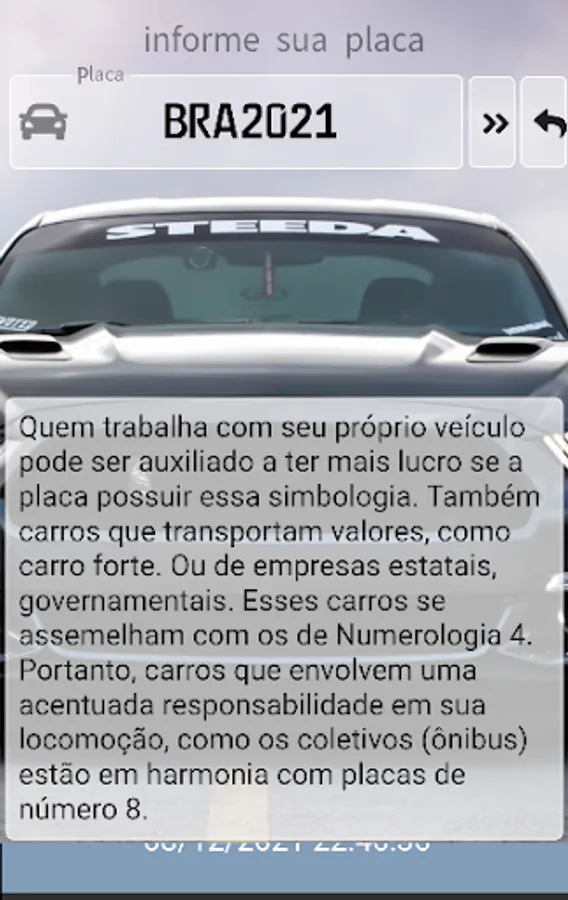 As a plate is formed by letters and numbers, to discover its symbology we need to add the numerical value of the letters with that of each digit.
