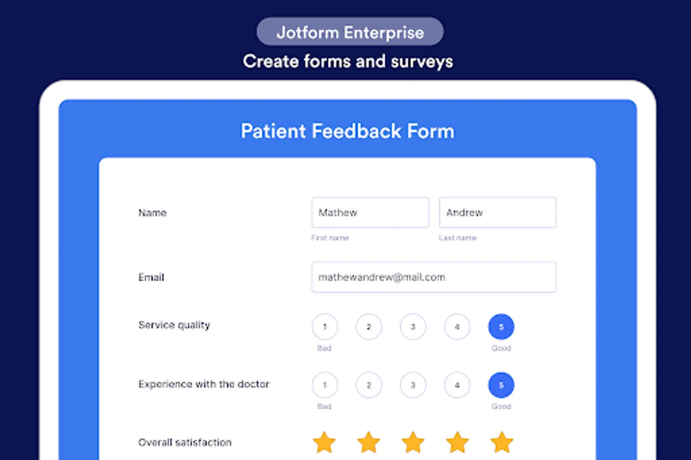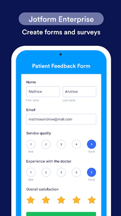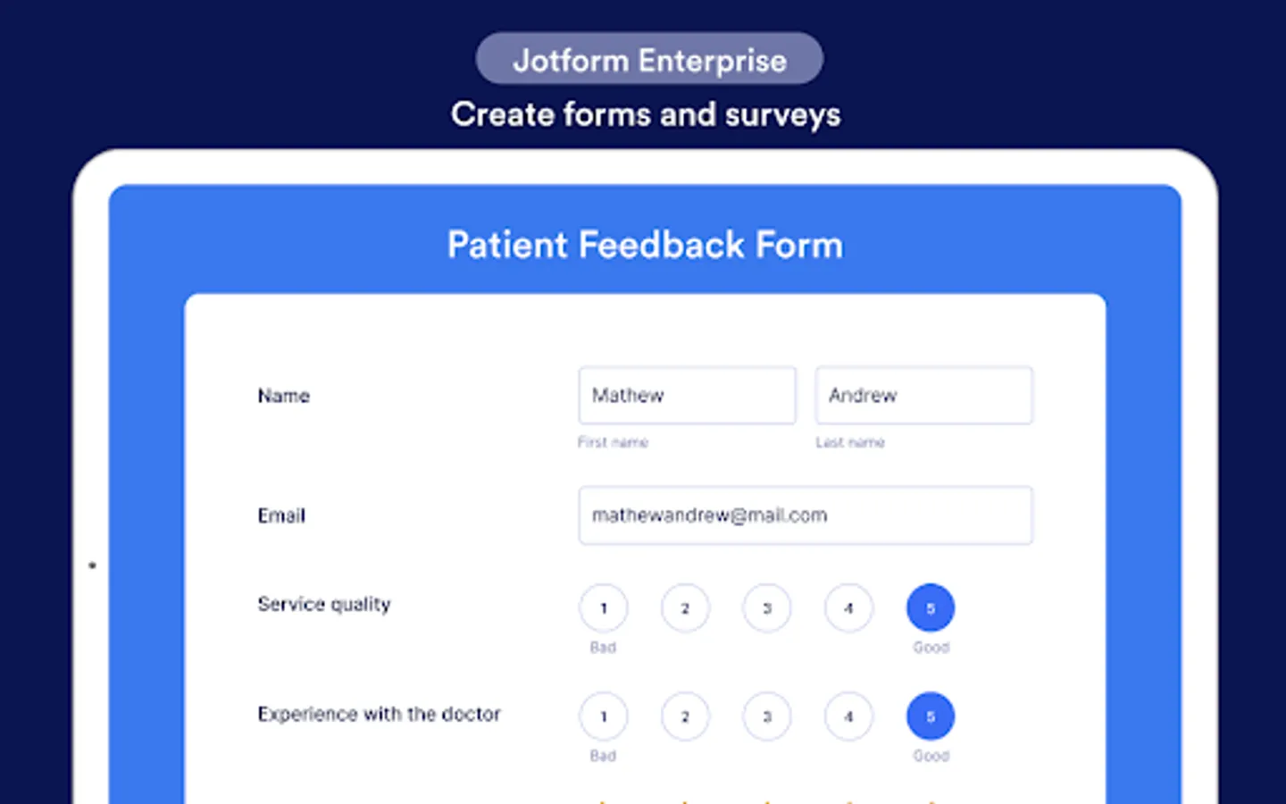 The Jotform Enterprise Mobile App is a mobile form builder that enables Jotform Enterprise users to create and fill out forms directly from their mobile device.