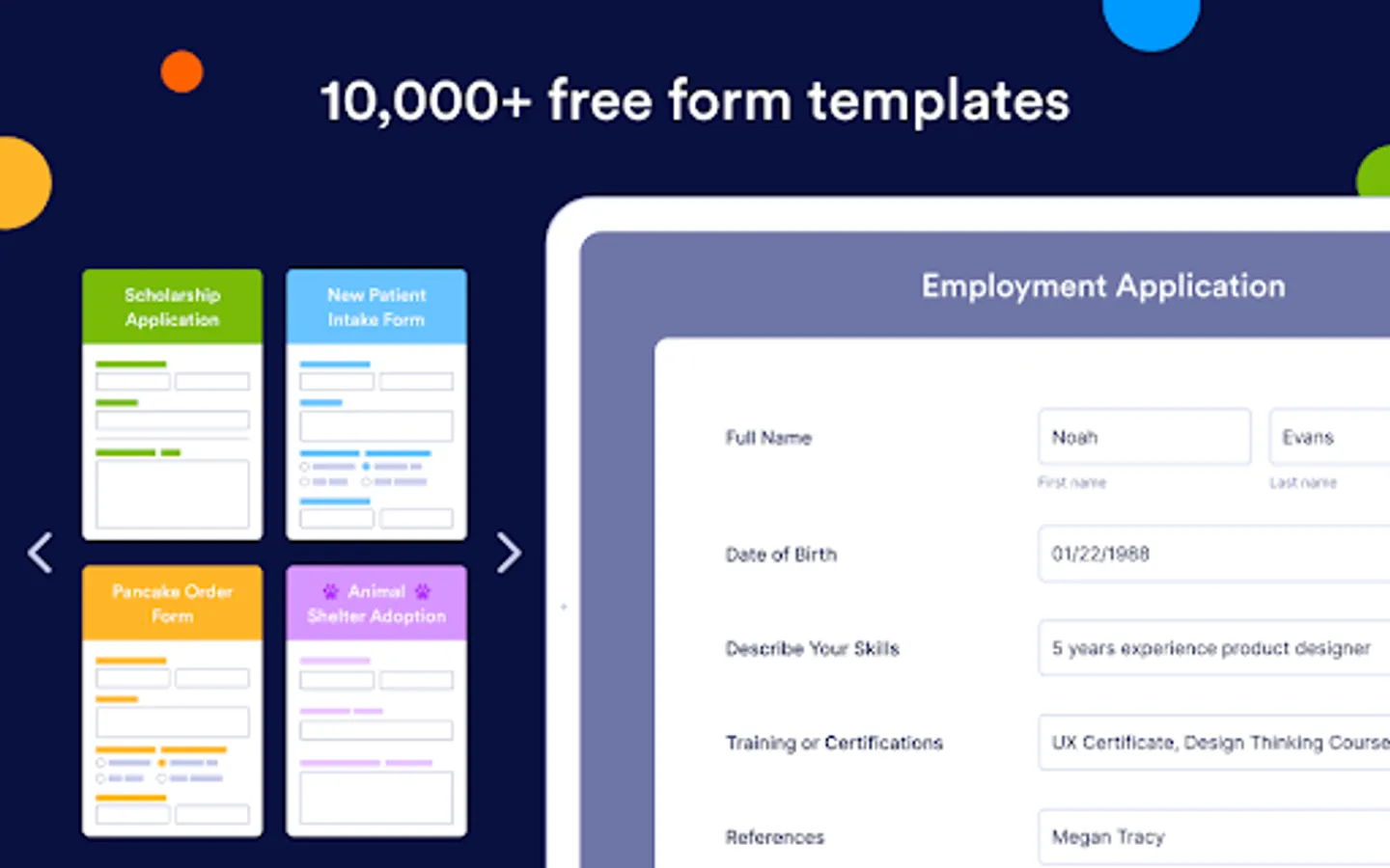 Jotform Online Filler Form App provides a great variety of ready-to-fill forms and surveys templates such as;