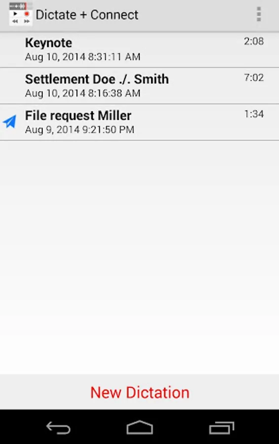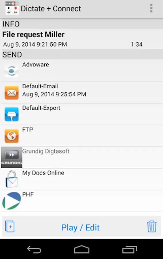 Check out “Dictate + Connect Free for Android”, our free limited version of Dictate + Connect for Android, to experience the functionality and feel of the full version. Dictate + Connect Free offers everything that Dictate + Connect does, but limits each single dictation to a length of 30 seconds instead of 24 hours. It also manages no more than 5 dictations at the same time.