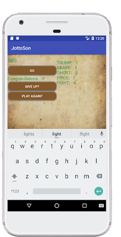 The goal of the game is to correctly guess the secret word which is of five letters without repeating letters. Once you enter your test word, the app announces how many letters match with the secret word. For example, if the secret word is BRAVE and the test word is BLACK, the matching letters are A and B, so the announced result is "2". Eventually you will have enough information to win by making a correct guess.