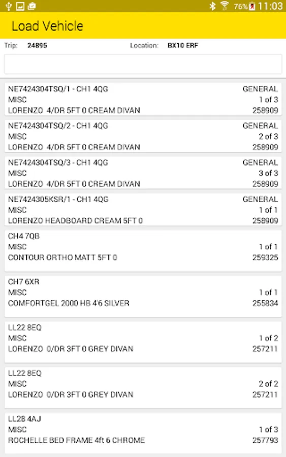 * Load A Vehicle - Shows a list of required stock for a Job or Trip which can be individually scanned to load onto a vehicle. The list keeps track of which items have been loaded in real time.