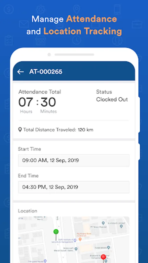 - Track their daily attendance, route taken and activities performed during the day via web browser.