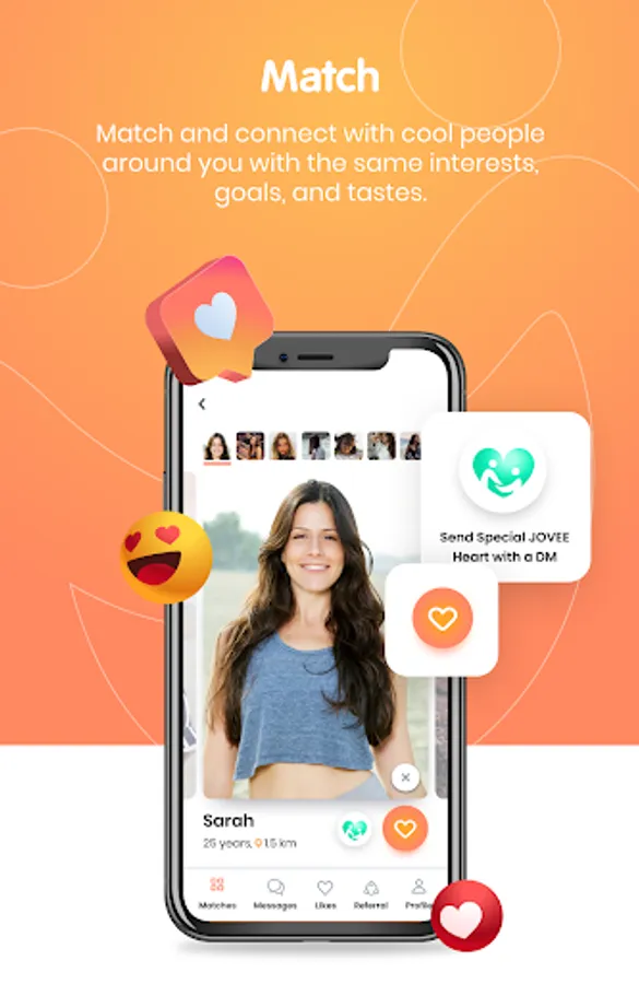 •JOVEE shows you candidates based on your preferences. Go through each one and if you like what you see press the orange heart to like or the green heart to send a super like with the option of a direct message!
