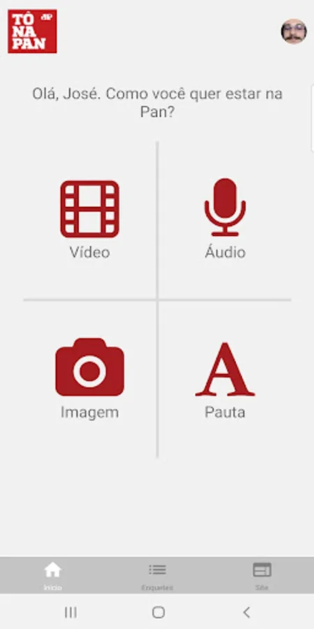 With the application “Tô na Pan” you register what is happening in your street, neighborhood, city or region and send it to Jovem Pan's journalism. Your collaboration sent by the app in video format (up to 1 minute long) , photo or audio (up to 3 minutes long), can be selected and disseminated during the broadcaster's programming.